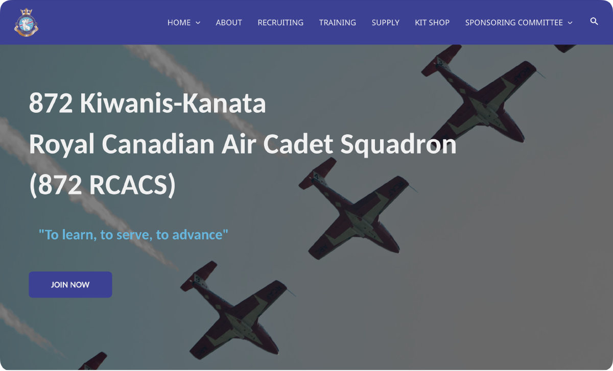 A final-semester team project at Algonquin College to rebuild the website of 872 Kiwanis-Kanata Royal Canadian Air Cadet Squadron. The existing site was outdated and hard to navigate; our mandate was a modern, accessible WordPress rebuild that reflected the program.